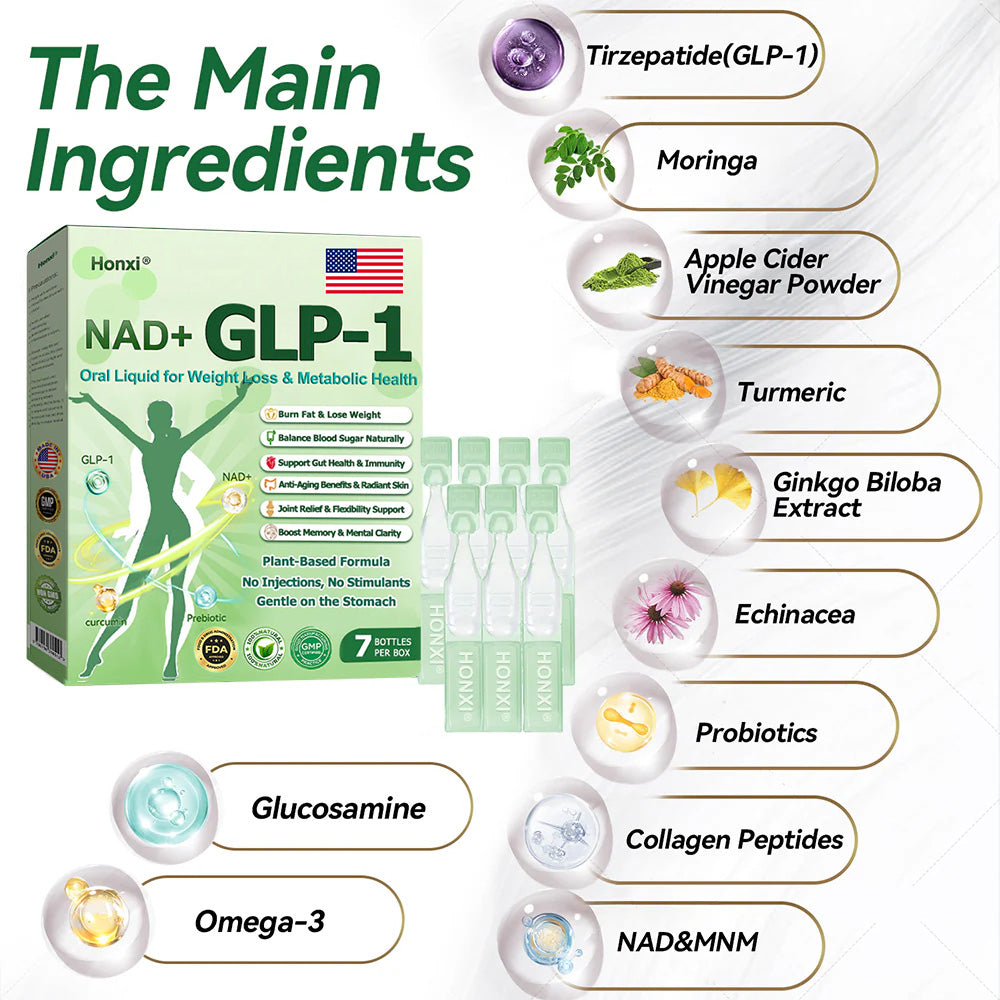Honxiยฎ NAD+ GLP-1 Six in One Health Solution Oral Liquid was developed by a team of over 30 experts in international endocrinology and diabetology after more than 3 years of research. It combines Tirzepatideย with powerful herbal ingredients to boost metabolism, accelerate fat burning, and support digestive and lymphatic health. This oral solution has been approved by the U.S. Food and Drug Administration (FDA) for its safety and efficacy, offering a scientifically backed solution for weight loss and overall wellness.